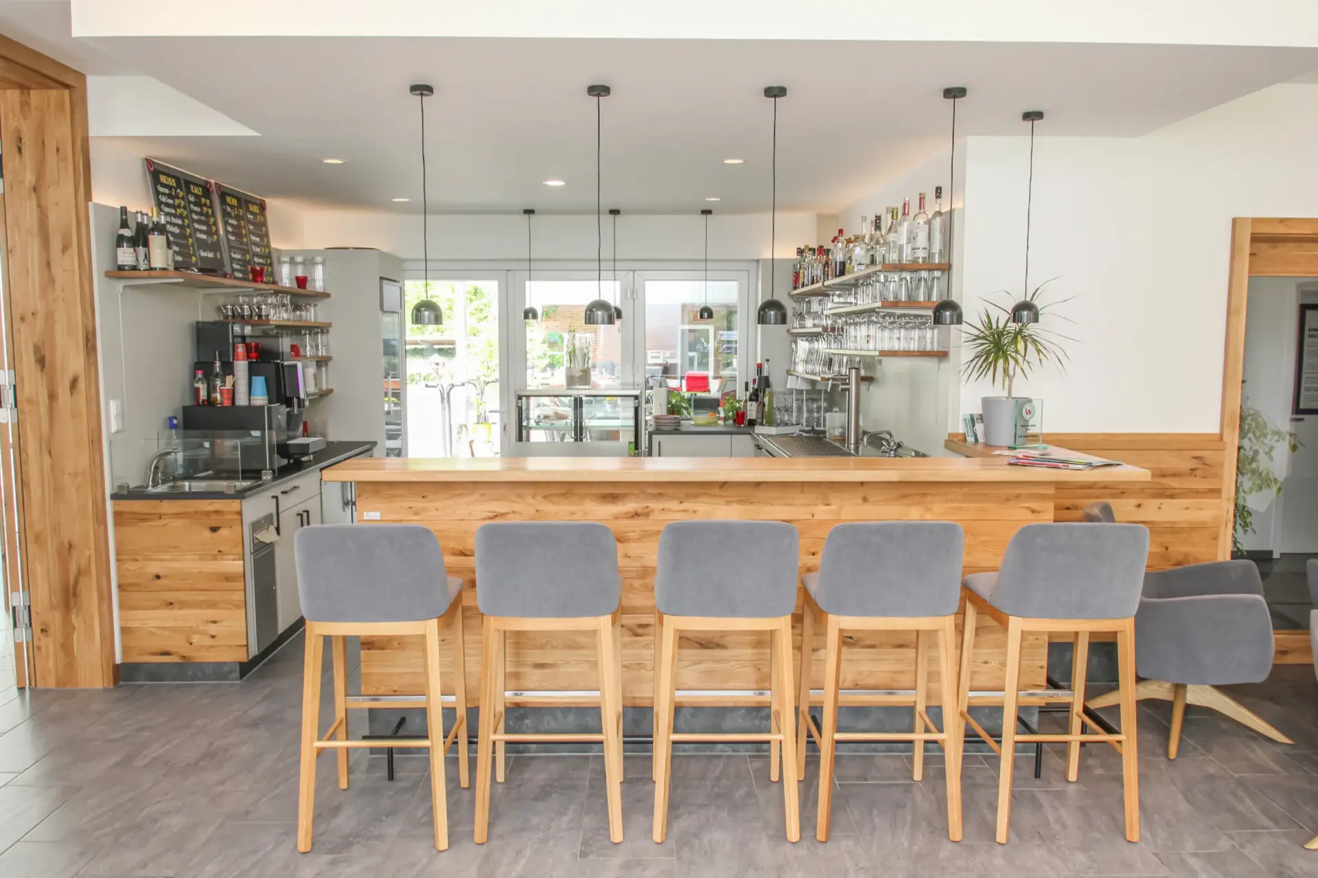 Zentrales Element ist eine umfassende Thekenanlage mit Rückbereich sowie integrierter, moderner Ausschank- und Kühltechnik. Die Übergänge zwischen den einzelnen Räumlichkeiten wurden durch massive Türverkleidungen sowie maßgefertigte Dreh- und Schiebetüren gestaltet. Darüber hinaus übernahmen wir die Lieferung aller Sitzmöglichkeiten.
